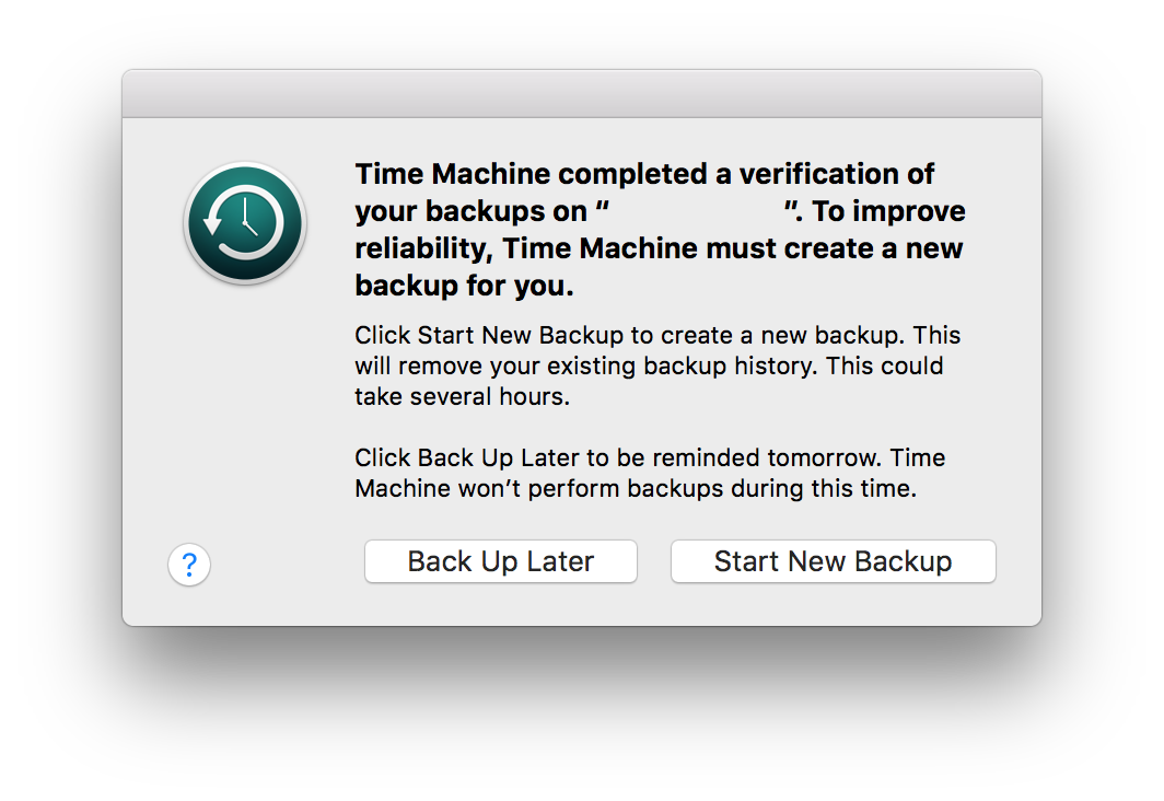 Either I lose my history by starting a new backup, or I stop taking backups. Sad face :( Happily there’s a third option: repair the corrupted volume. There are many articles on the internet about doing this manually, but I’m not going to keep cutting and pasting commands so I wrote a shell script: repair-time-machine-volume.